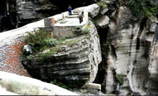 | Bheem Pul : Bheem Pul is situated opposite to the Vyas Gufa in Mana Village. It is a huge rock which acts as a natural bridge across the Saraswati River. The Saraswati River flows with force in between the two mountains and joins the Alaknanda River. It is believed that Bheem, one of the five Pandavas, threw a huge rock in order to make a path to join the two mountains so that Draupadi could easily walk over it. |