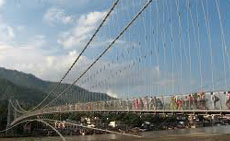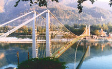 | Ram Jhula : The place (or the bridge) is equally popular with devotees and tourists. It remains suspended 3 km north of Rishikesh town. It attracts most visitors due to the fact that it lies just close to the popular ashrams - Geeta Bhawan and Swarg Ashram. Visitors cannot afford to miss the enchanting evening prayer (which lasts for 30 minutes) at the Geeta Bhawan ghat. Food lovers can head straight to the 50-year-old and the very famous Chotiwala Restaurant, located in Ram Jhula. |
