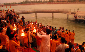 | Triveni Ghat : The most popular bathing ghat in Rishikesh, the Triveni Ghat is the point where River Ganges takes a complete right angle turn. Hindus also believe that it is here that the three holy rivers Ganga, Yamuna and Saraswati converge. Every morning, scores of pilgrims and devotees can be seen here taking a holy dip in the divine waters of the Ganga. In the evening, the sight at the ghat is simply heart stirring. Vedic chants, to the accompaniment of drums and bells, can be heard all around and a spiritual aura surrounds the whole place. Tiny oil lamps on bedecked leaf boats floating on the Ganges add much charm to the whole atmosphere. |